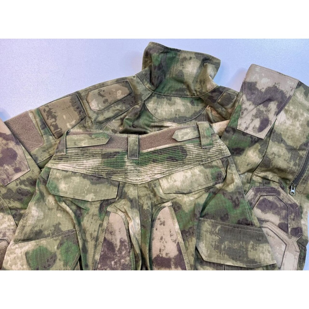 - Брюки: Брюки имеют боковые карманы на молнии и широкие ременные петли, позволяющие использовать тактические ремни различных размеров. Поясной элемент оборудован усиленной фиксирующей стропой на велкро. Нижняя часть штанины застегивается на молнию, а также имеет клапан. Карго-карманы на набедренных частях и тыльные карманы обеспечивают удобство носки и хранения мелочей.