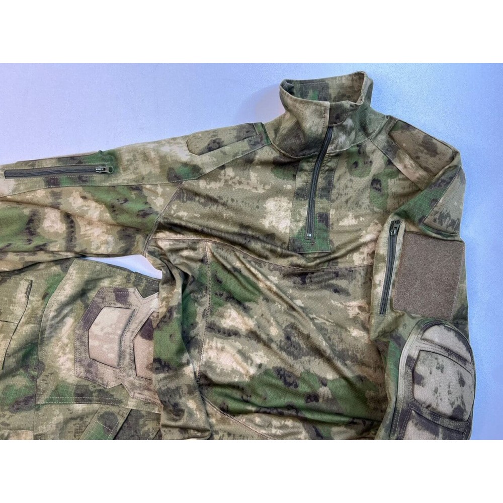 - Дизайн и расцветка: Комплект доступен в расцветках "мох" и "мультикам", что позволяет хорошо маскироваться в различных окружающих условиях. Особенностью рубашки является камуфляжная основа, а не однотонная ткань.