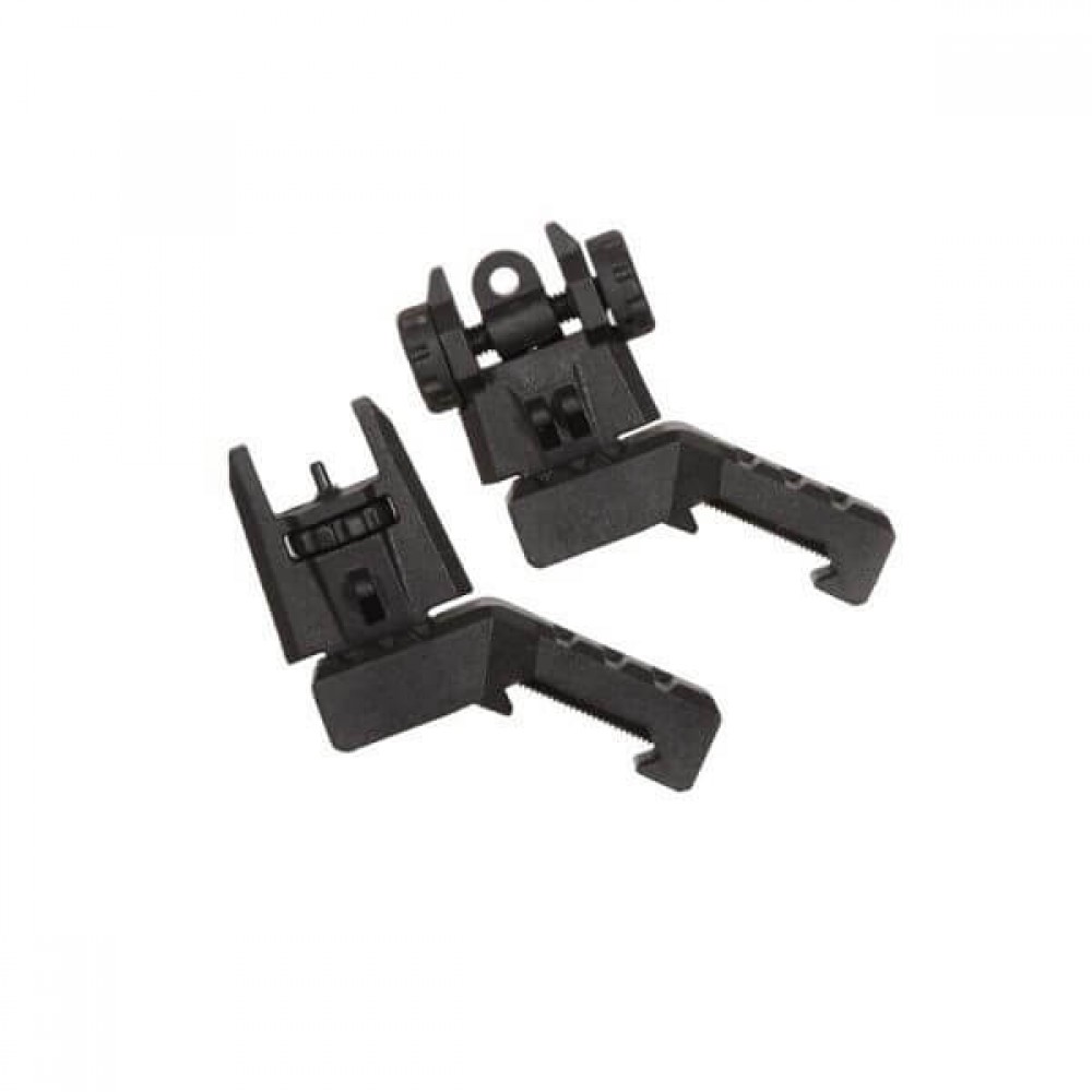 Эти целик и мушка небольшие и устанавливаются сбоку на планку Пикатинни, образуя угол 45 градусов с основным прицелом.